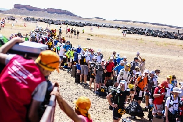 Competitors await check-in the day before the race start where they turn in medical forms, get their kit checked, and send extra luggage back to civilization. Photo: Kirsten Kortebein