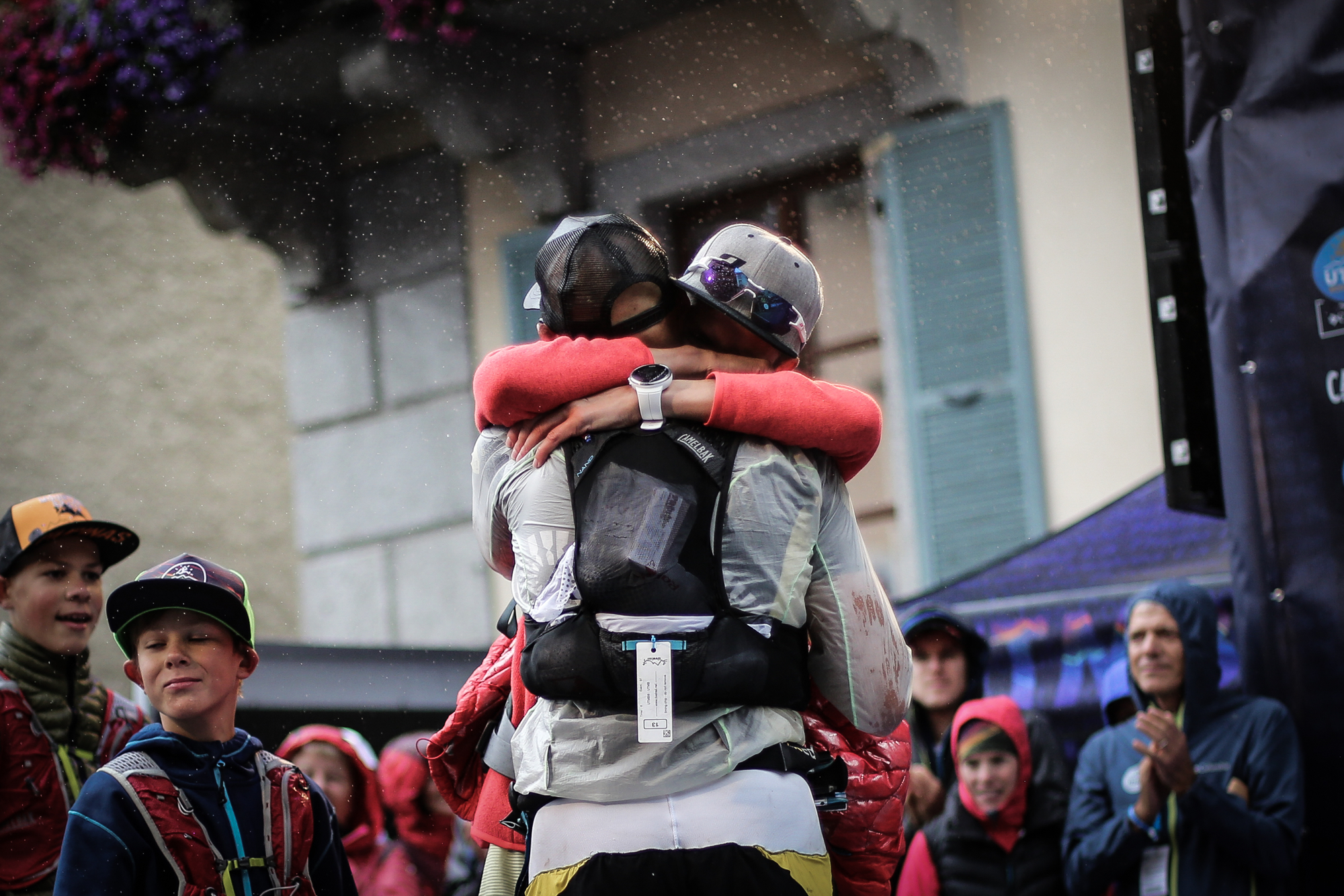 François D’haene and Kilian Jornet, of Spain, share a hug after they go one-two at UTMB 2017. Photo: iRunFar/Kirsten Kortebein
