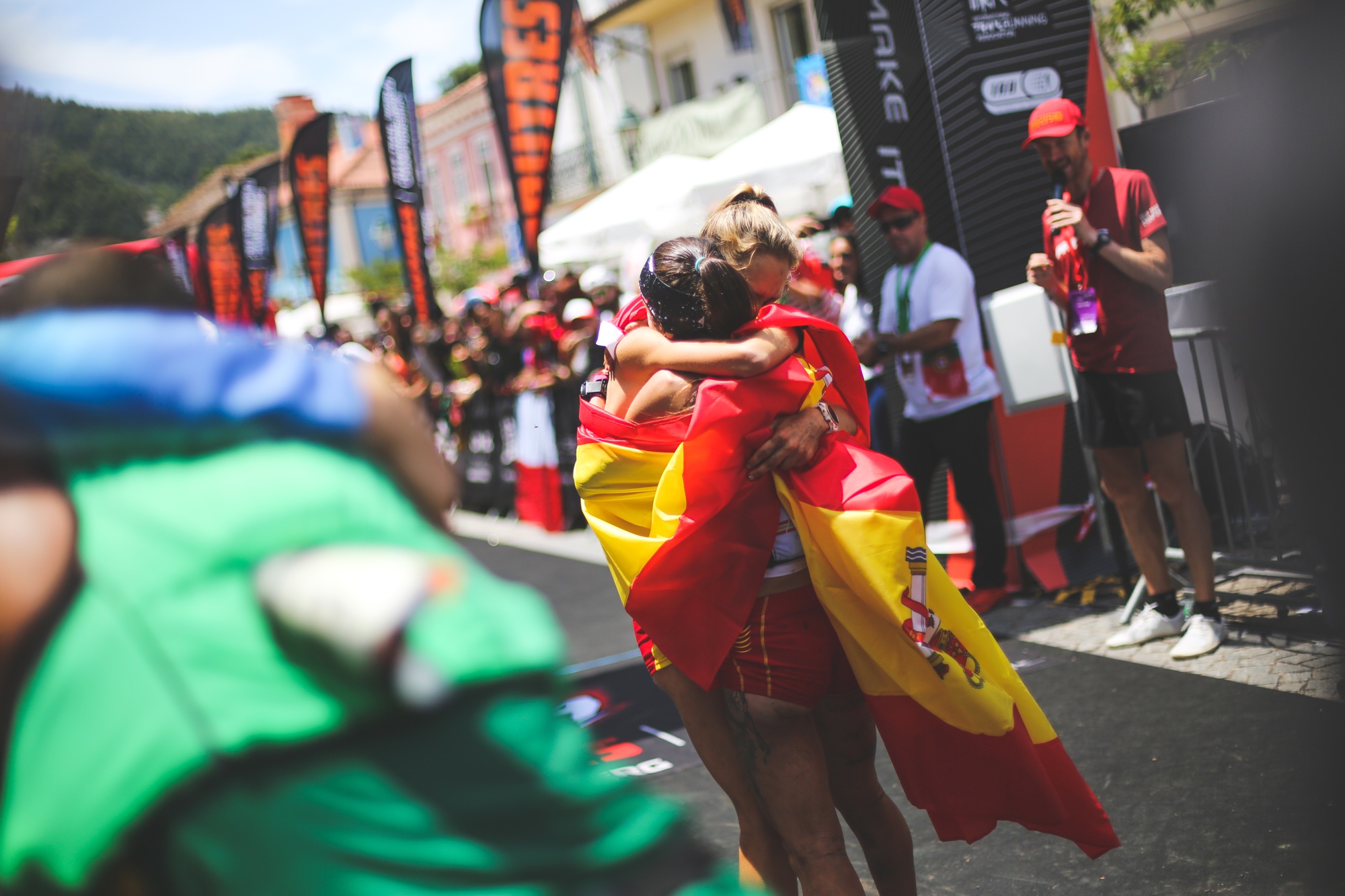 Spain’s Sheila Avilés and Azara García embrace after finishing third and fourth, respectively, and just seconds apart.