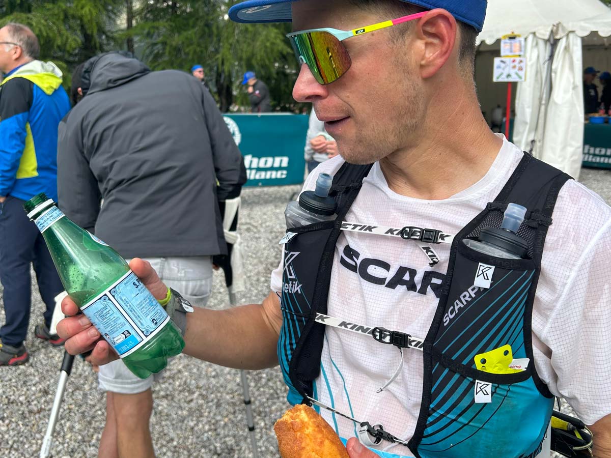 Your author going local by swapping out potato chips and Coca-Cola for San Pellegrino and Italian plum cakes at the Mont Blanc 90k. Photo courtesy of Gabe Joyes.