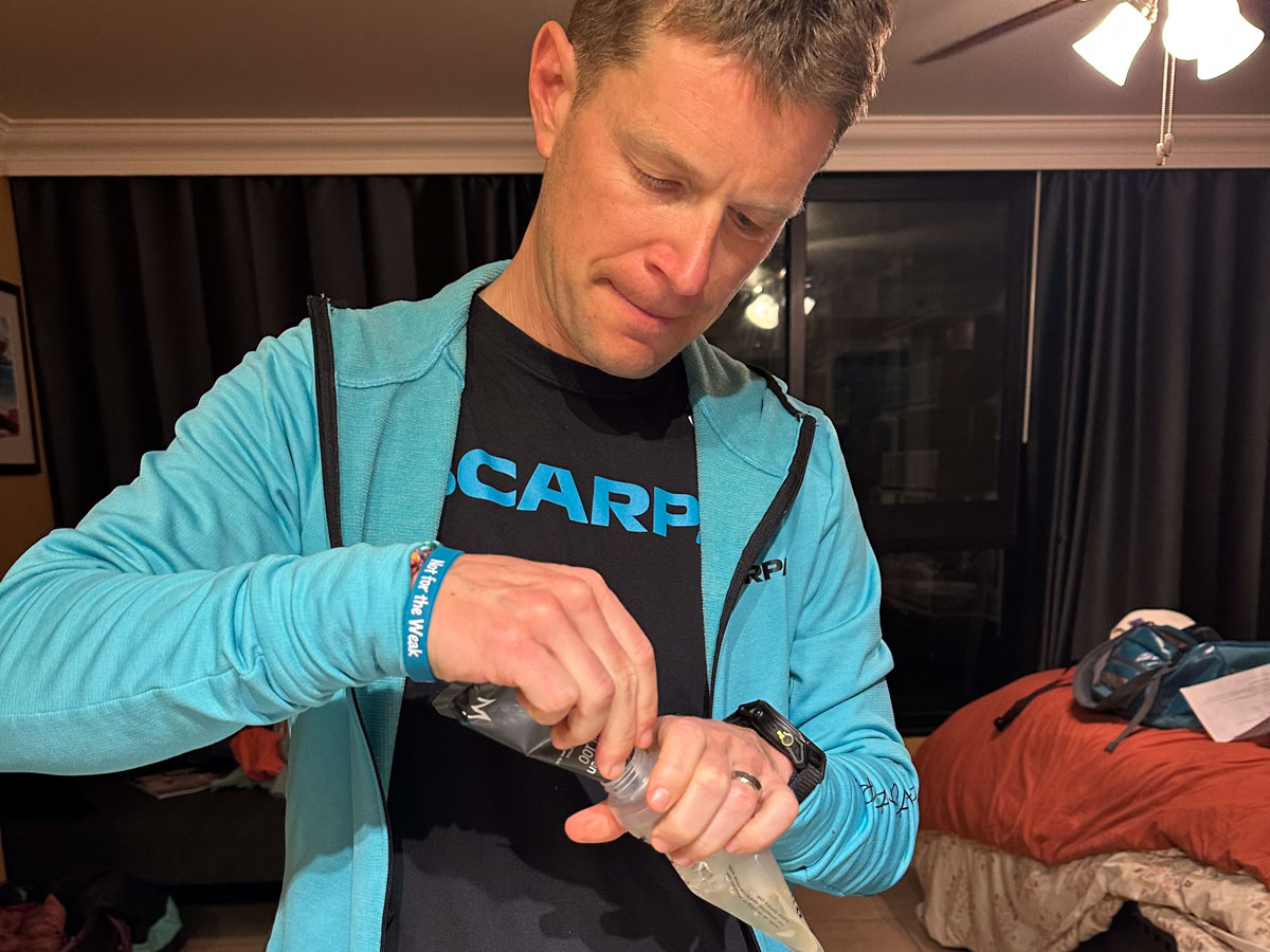 Your author getting ready to eat 55 unflavored gels over the course of HURT 100. Photo courtesy of Gabe Joyes.