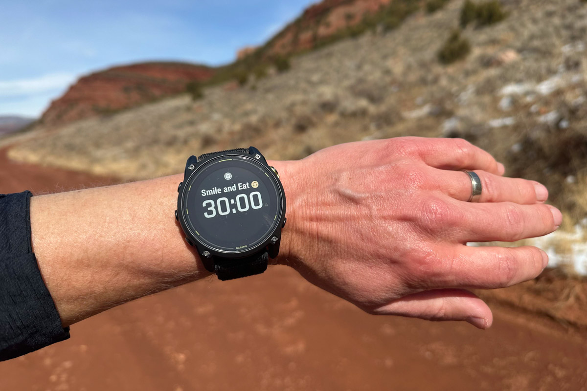 The 30-minute “smile and eat alarm” on my watch from an early spring long run. Photo courtesy of Gabe Joyes.