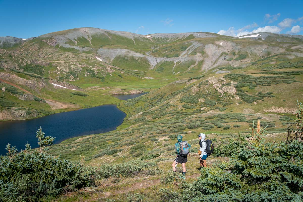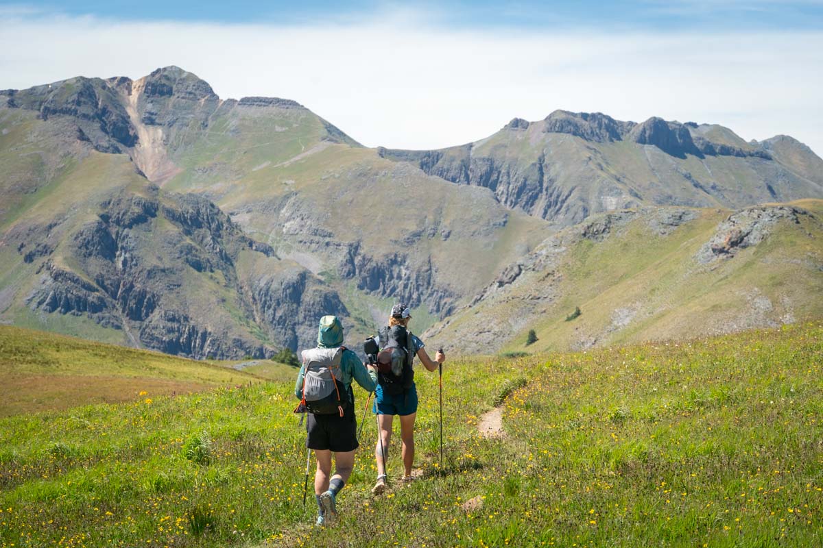Meghan Hicks and Maggie Guterl test fastpacking packs in the Colorado mountains. Photo: iRunFar/Eszter Horanyi