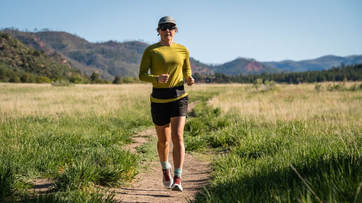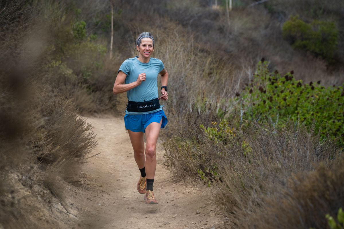 iRunFar Editor-in-Chief Meghan Hicks tests the Ultimate Direction Race Belt on a run outside Moab, Utah. Photo: iRunFar/Eszter Horanyi