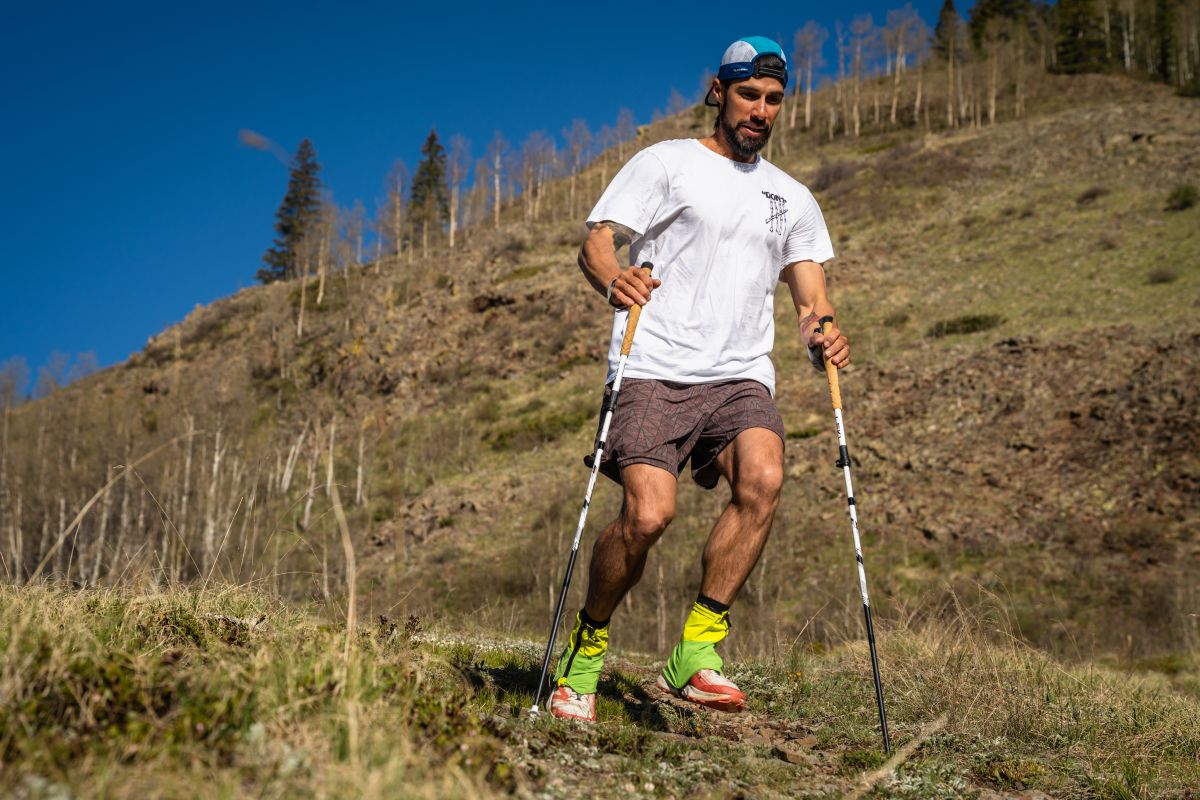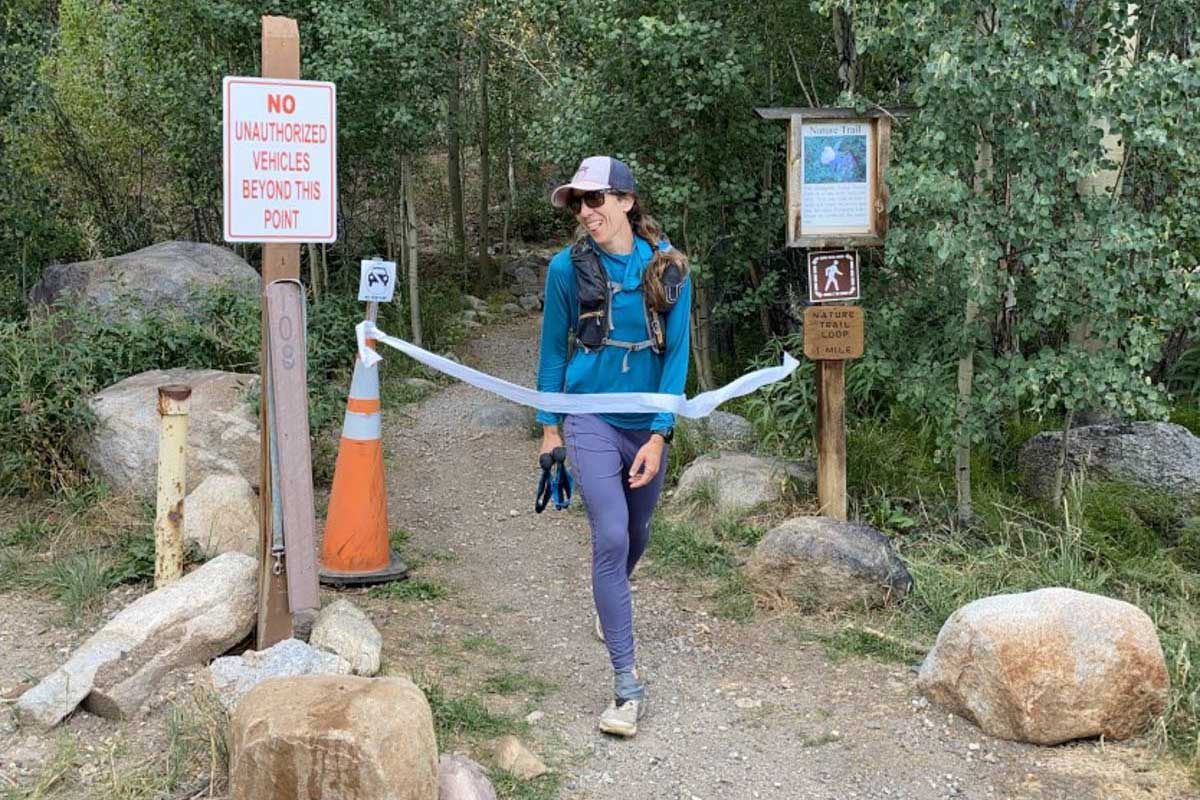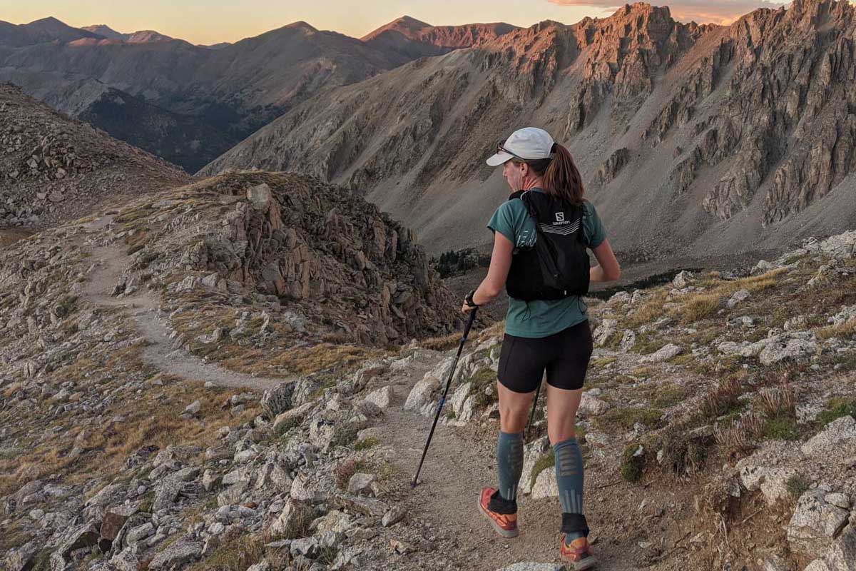 iRunFar’s Eszter Horanyi sets a new unsupported Nolan’s 14 FKT wearing a pair of Altra Trail Gaiters. Photo: Kevin Schmidt