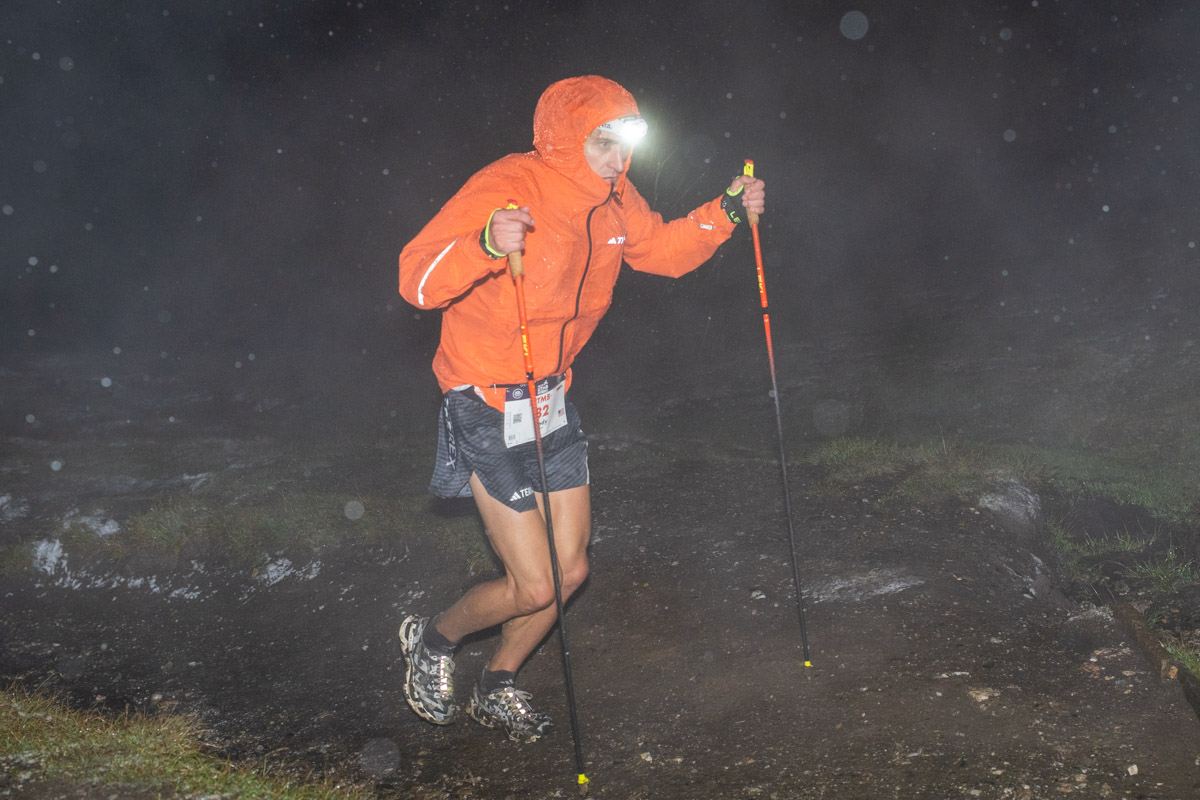 Cody Lind trusts a Petzl headlamp during a nighttime snowstorm on Grand Col Ferret at the 2025 UTMB. Photo: iRunFar/Eszter Horanyi