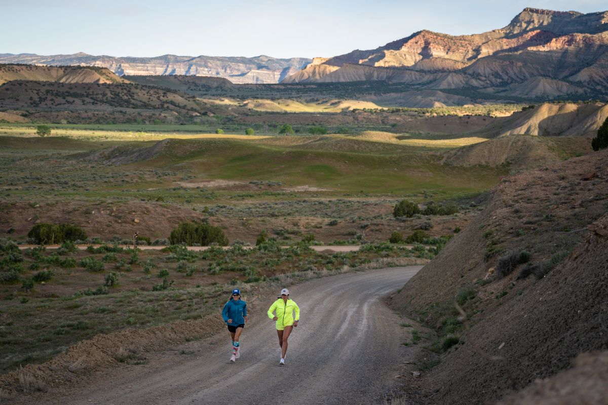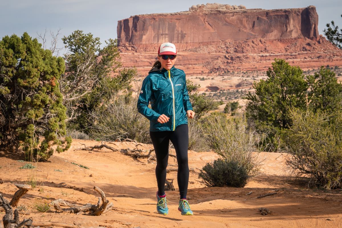 iRunFar’s Meghan Hicks wearing the Montbell Rain Trekker Jacket for warmth during a fastpacking trip in Utah. Photo: iRunFar/Eszter Horanyi