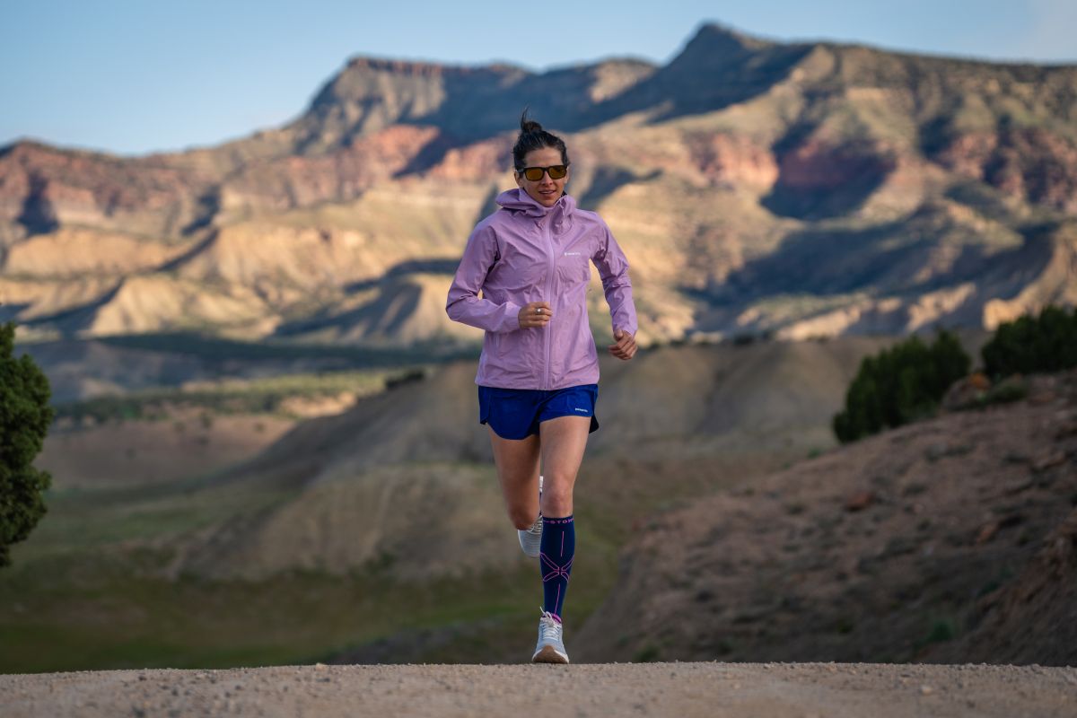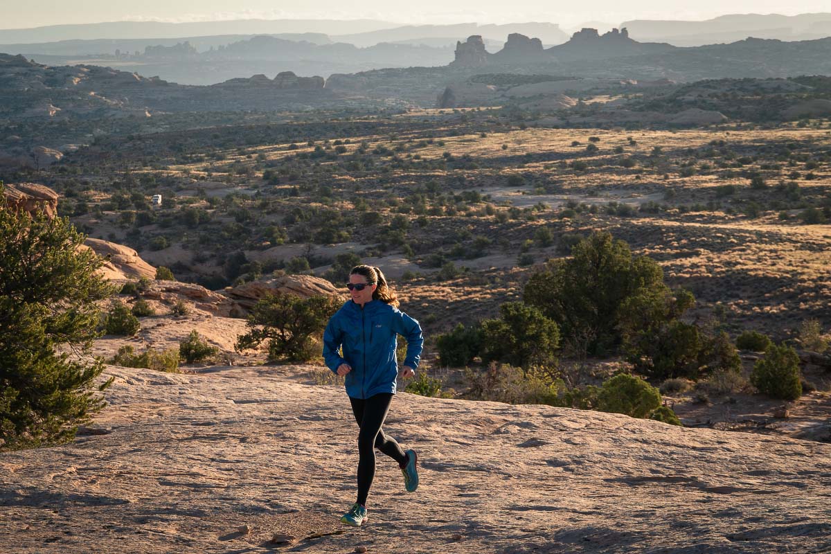 Meghan Hicks tests a lightweight rain jacket on a cool desert morning. Photo: iRunFar/Eszter Horanyi