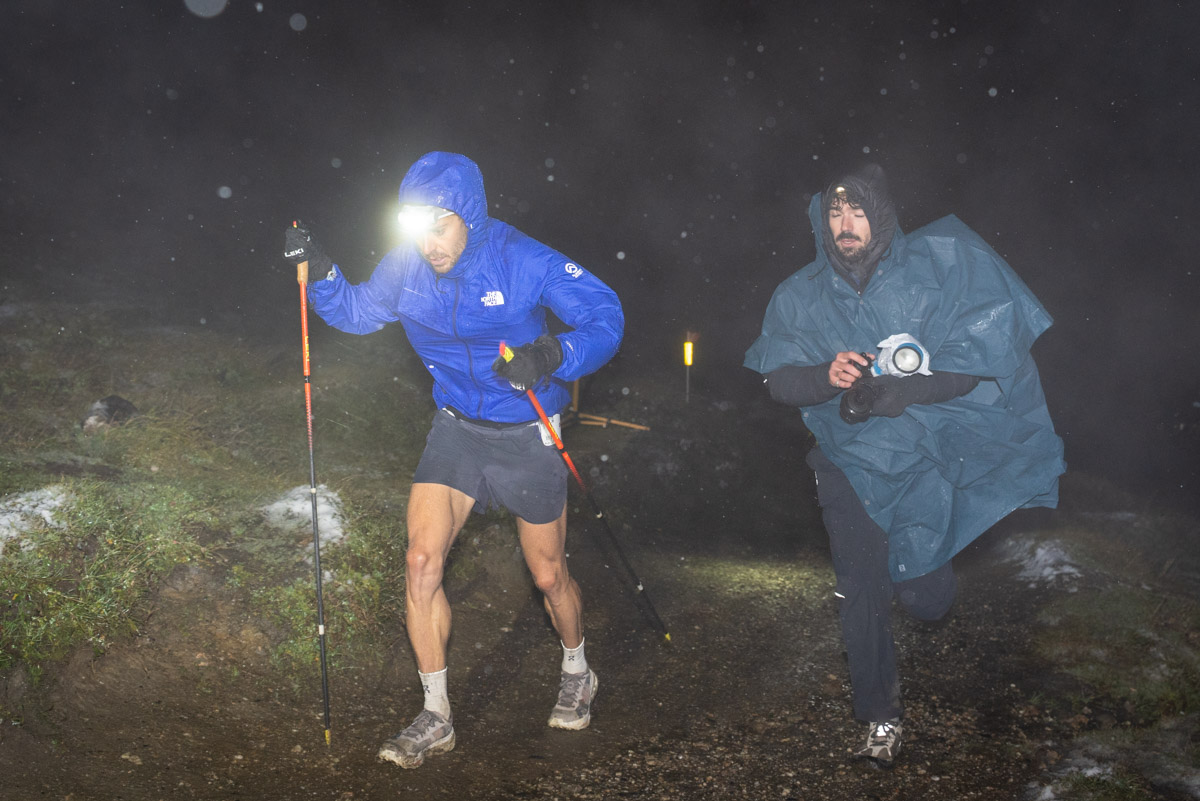 Germain Granger and a photogapher take different approaches to rain gear during the overnight rain at the 2025 UTMB. Photo: iRunFar/Eszter Horanyi