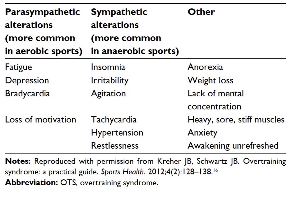 The most common OTS symptoms. It should be noted that parasympathetic and sympathetic alterations refer to the two divisions of your autonomic nervous system where parasympathetic is responsible for the ‘rest and digest’ bodily functions, and sympathetic is responsible for the ‘fight or flight’ bodily functions. Additionally, bradycardia means a low heart rate (below 50 beats per minute) and tachycardia means an elevated heart rate (over 100 beats per minute at rest). Image courtesy of Kreher, J. (2016). Diagnosis and prevention of overtraining syndrome: An opinion on education strategies. Open Access Journal of Sports Medicine,Volume 7, 115-122. doi:10.2147/oajsm.s91657.