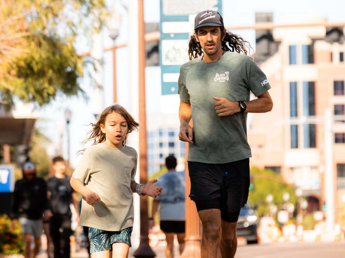 Jamil Coury, 2025 Chipotle Challenge winner and 2026 Burrito League instigator, runs with his son during the 2026 Tempe Burrito Challenge. Photo: Andrew Bottiglieri