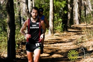 Ian Sharman running toward a course record at the 2011 Rocky Raccoon 100. (Copyright Josh Baker, endurophoto.com).