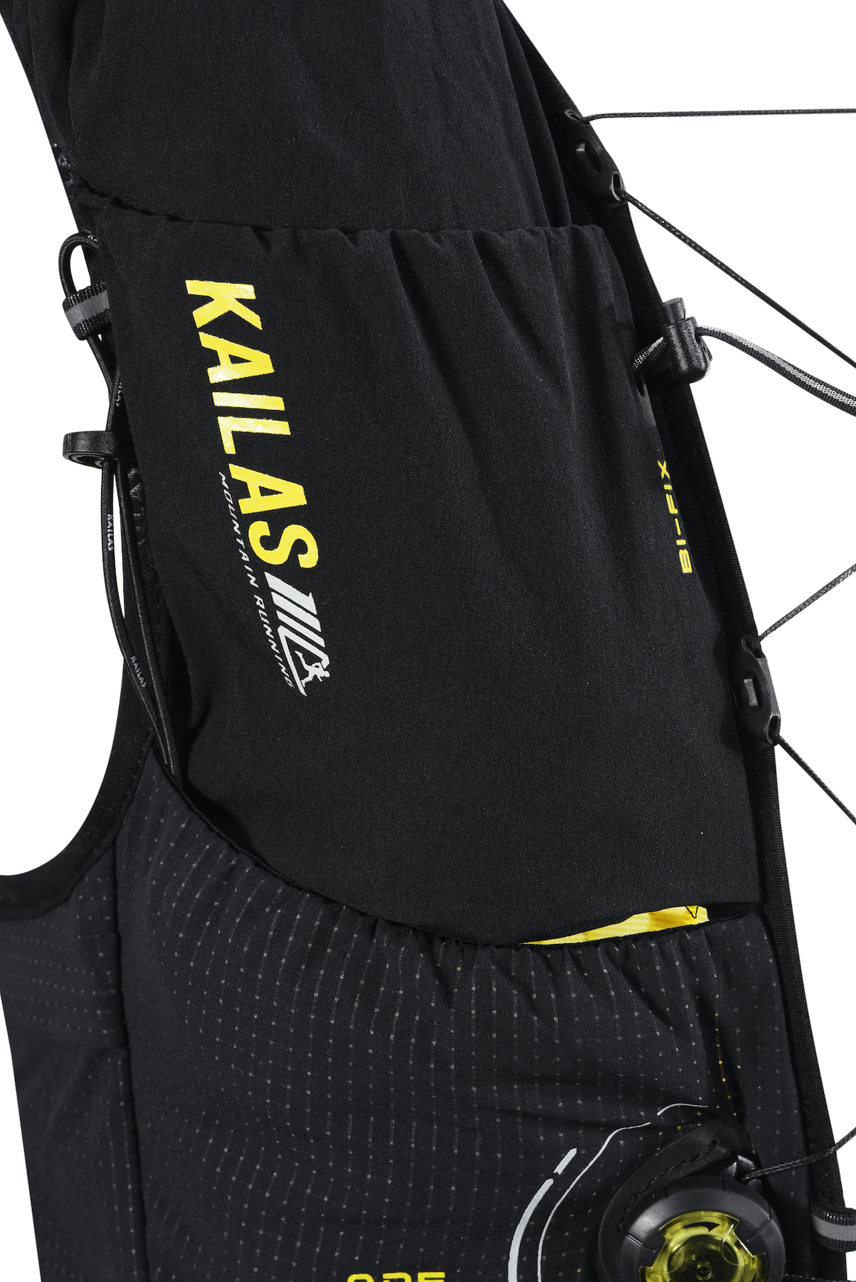 The dual water bottle pockets on the front of the Kailas Fuga Air II 8L pack have a unique cinching mechanism to keep half empty bottles from sloshing.