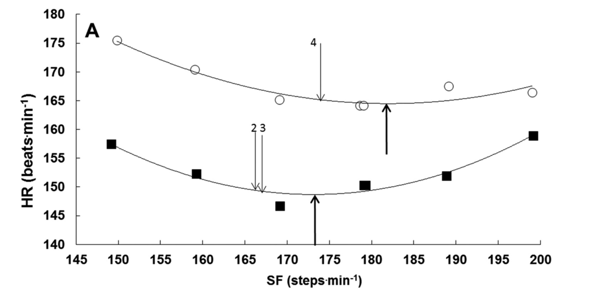 Humans self-select a running cadence that is near to their optimal cadence. This graph shows the data of one runner where the bottom line and solid squares represent the athlete running at about 13 kilometers/hour and the upper line and open circles represent about 16 kilometers/hour. The runner was instructed to run at various cadences from 150 steps/minute to 200 steps/minute while their heart rate was recorded. The runner was asked what step frequency felt the best (their preferred cadence), and this is signified with the downward arrows. Upward-pointing arrows indicate the cadence deemed most optimal for that speed, or the point of the athlete’s lowest maintained heart rate. Image: Ruiter, C. J. D., Daal, S. V., & Dieën, J. H. V. (2019). Individual optimal step frequency during outdoor running. European Journal of Sport Science, 1–9. doi: 10.1080/17461391.2019.1626911 (8)