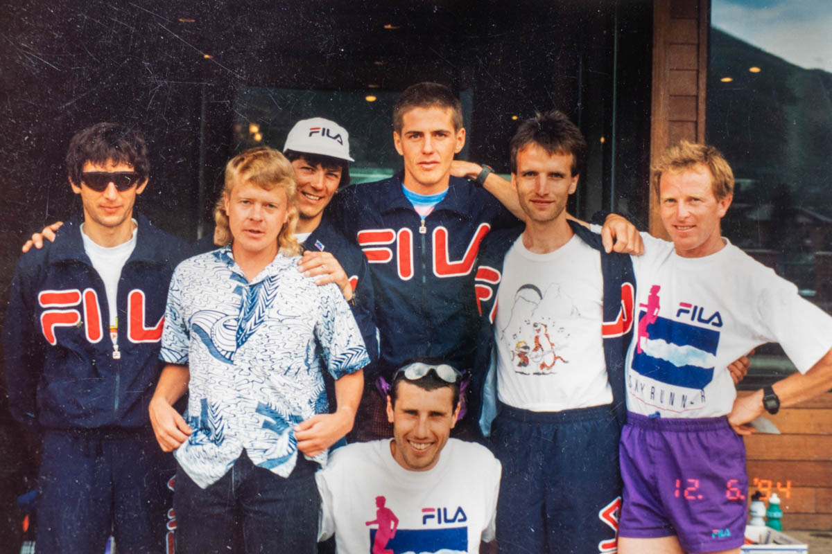 The 1994 Fila Skyrunning Team (left to right): Adriano Greco (Italy), Jay Johnson (U.S.), Fabio Meraldi (Italy) (front), Matteo Pellin (Italy), Silvano Fedel (Italy), Matt Carpenter (U.S.), Ettore Champretavy (Italy). Photo courtesy of Filippo Caon.