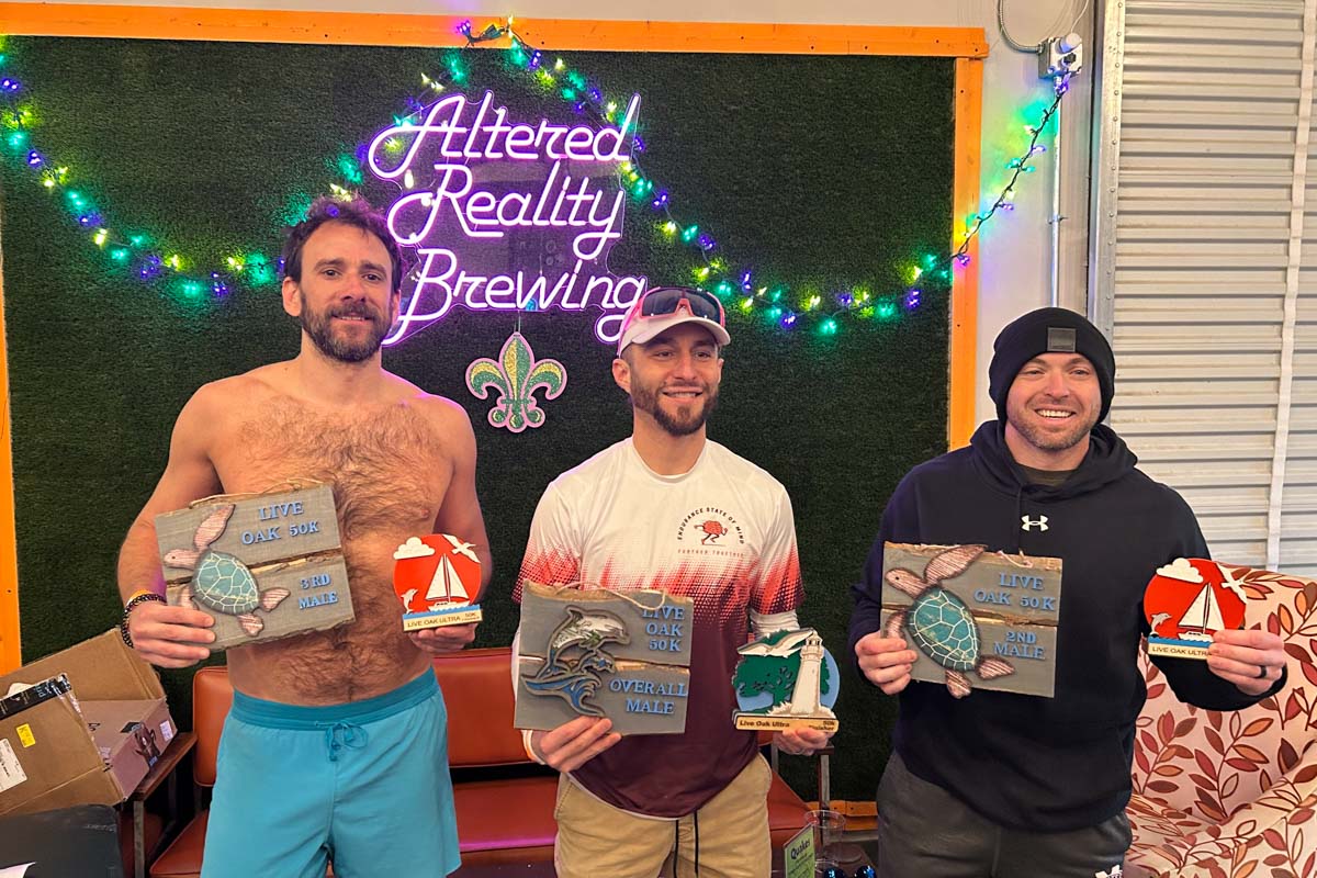 The 2026 Live Oak Ultra 50k men’s podium (left to right): 3. Ricky Greer, 1. Zachary Vogt, 2. Jamie Stevison. Photo courtesy of the race.