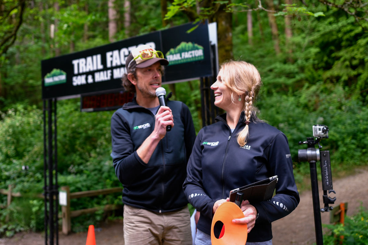 Todd and Renee make the pre-race announcements at the 2016 Trail Factor 50k and Half Marathon. Photo: Paul Nelson